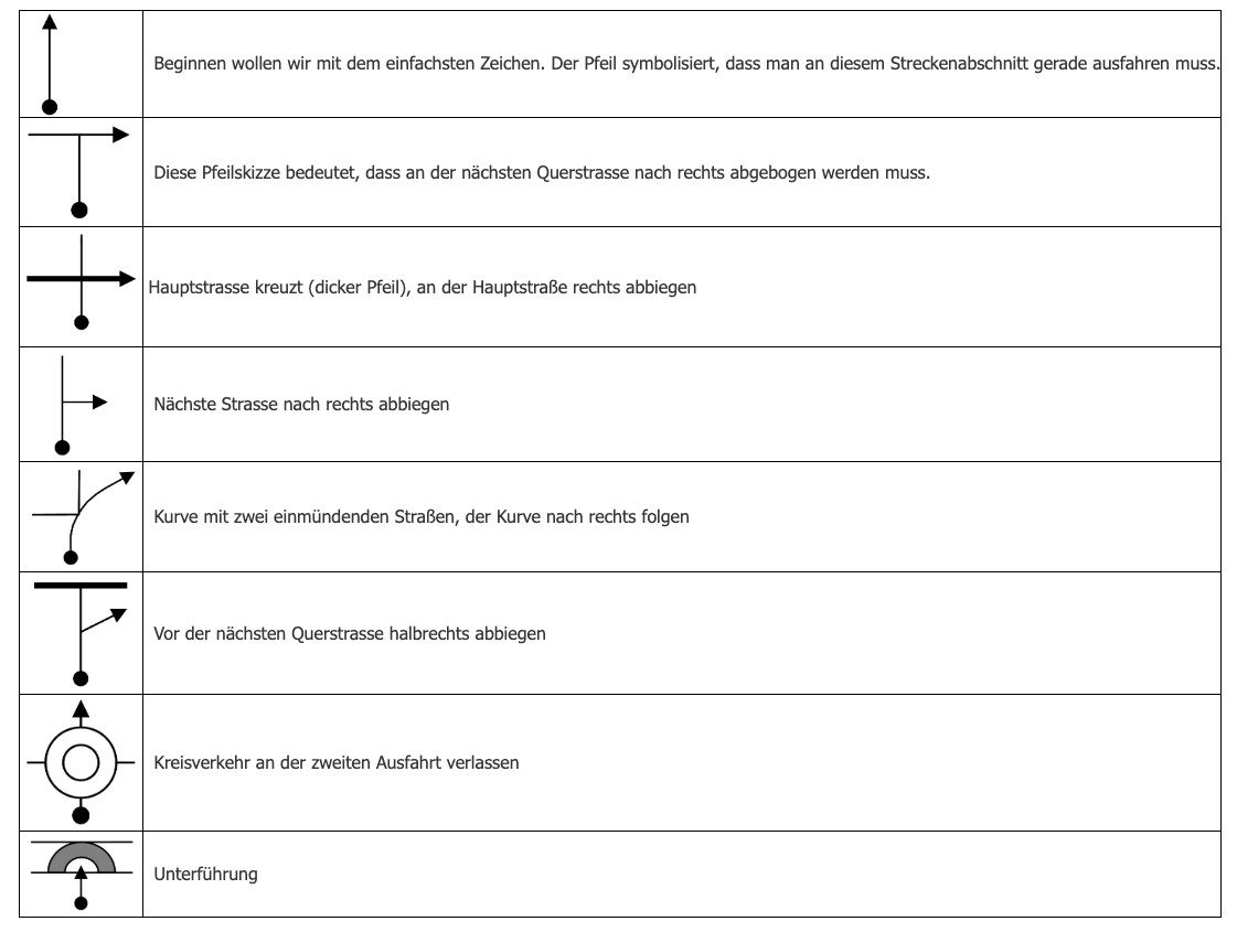 Die sogenannten Pfeilskizzen sind ein leicht verständliches System zur Streckenbeschreibung. Statt langer Texte zeigt jede Skizze grafisch den Streckenverlauf an.